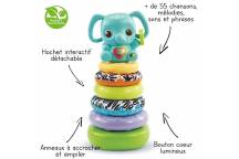Avec Nino, éléphanteau empilo 3 en 1, votre tout-petit secoue le hochet pour déclencher des chansons, des sons et des phrases amusantes. Bébé peut aussi accrocher les anneaux entre eux ainsi que jouer avec la tour à empiler.