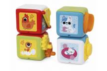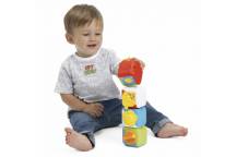 De 10 à 18 mois : L’enfant commence à empiler les cubes de façon aléatoire et découvre les activités sensorielles sur chaque cube (effets sonores, engrenages, fenêtres tournantes, etc.).