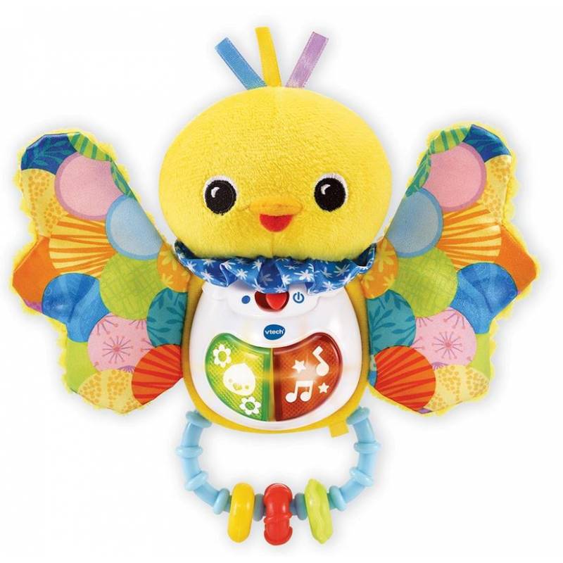 Les différentes matières colorées et les boutons lumineux de ce petit oiseau stimulent tous ses sens.