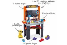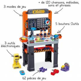 Première étape : monter son établi ! Une fois son établi assemblé, votre enfant peut suivre les projets proposés dans les guides avec les pièces de construction et les outils ou laisser libre cours à son imagination. Les boutons lumineux lui feront découvrir les outils et les couleurs de manière ludique ou en chansons.