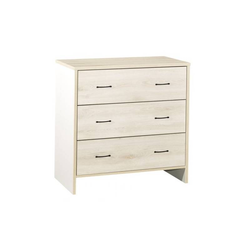 Cotés, tablette inférieure en panneaux de particules mélaminés décor blanc, chants décor bois. Faces de tiroirs et dessus en panneaux de particules mélaminés décor hêtre cendré, chants décor bois. Tiroirs sur coulisses à galet. 6 poignées en métal, finition noir époxy.