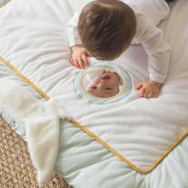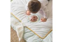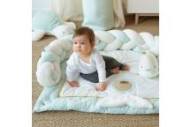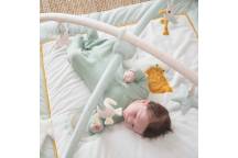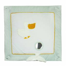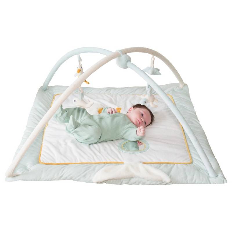 Matières douces et moelleuses, couleurs et motifs tendances, ce tapis de jeu propose 22 activités sensorielles : miroir, papier bruissant, hochet... Bébé retrouvera ses amis Irène la baleine, Manu la tortue, Paulette la mouette et Bérangère l’étoile de mer du thème au large de Nova suspendu sur l’arche.