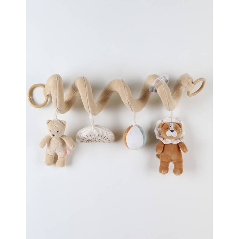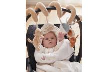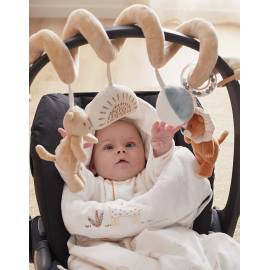 La spirale d'activités ludique de la collection Babou & Kendi se fixe facilement au parc, siège auto groupe 0 ou encore poussette grâce à sa forme particulière et ses attaches en forme de C.
