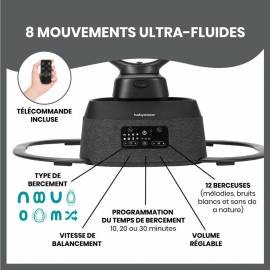 Pour apaiser bébé, la Swoon Evolution intègre également 12 musiques (mélodies, bruits blancs et sons de la nature). Et grâce à sa télécommande, il vous sera possible de tout gérer à distance (mode de bercement, vitesse, minuteur et mélodies).