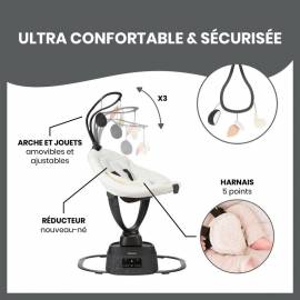Cette balancelle est un vrai bijou technologique, elle offre l’alliance de 8 mouvements de balancement ultra-fluides sur 5 vitesses, comparable aux sensations ressentis dans les bras des parents.