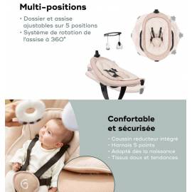 Faites participer bébé aux moments de vie sans vous soucier de déplacer la Balancelle électrique grâce à son assise rotative à 360°. Installer votre tout-petit confortablement en fonction des différents moments de la journée grâce à son cocoon réducteur pour le sommeil ou encore son arche de jeux amovible pour l'éveil.