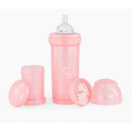 Le biberon anti-colique Twistshake neutralise les coliques infantiles avec une valve à air et un tamis. Sans BPA. Tétine douce et ronde.