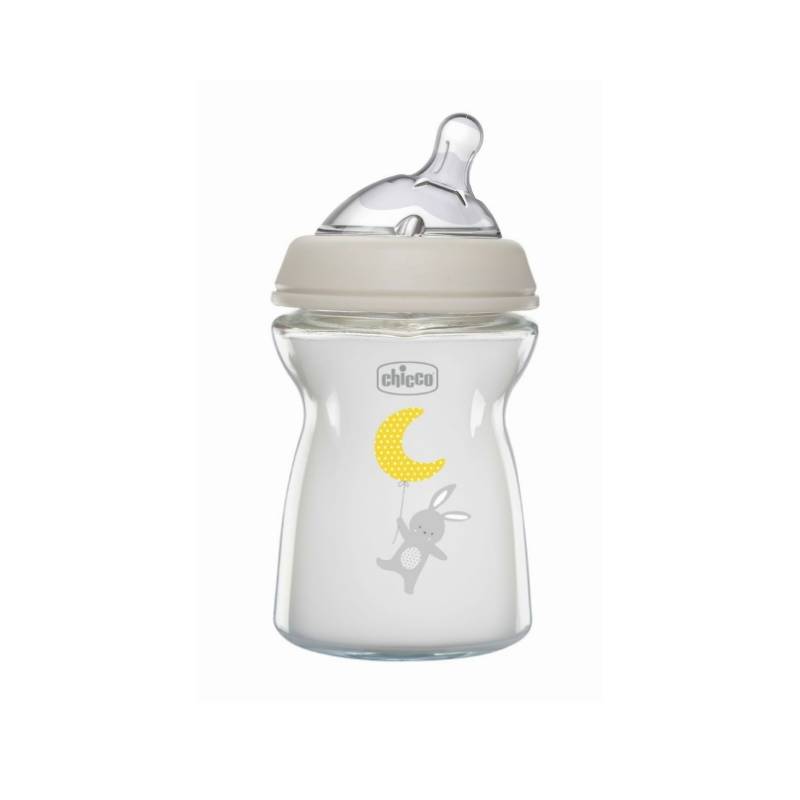 Le Biberon Natural Feeling Verre 0m+ 250 ml Flux Lent Gris de Chicco reproduit de manière instinctive les mouvements naturels de succion du bébé pour faciliter la transition entre l'allaitement maternel et le biberon.
