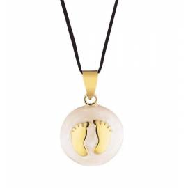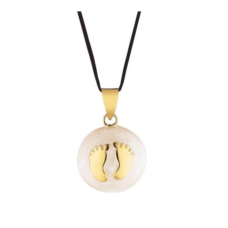 Ce joli pendentif est décoré de petits pieds dorés à l'or fin 18 carats : Un avant-goût de ceux de votre bébé !