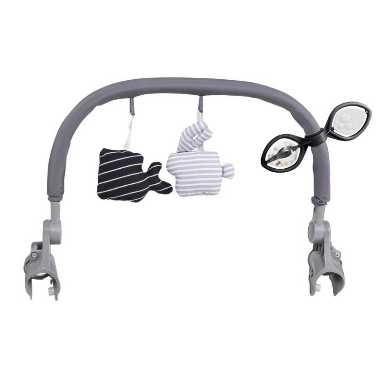Barre de jeu inclinable, qui peut être utilisée aussi bien en configuration transat/relax qu'en configuration chaise haute.