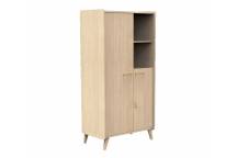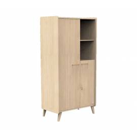 2 Côtés dessus, dessous, séparation verticale, 5 tablettes mobiles, 1 tablette fixe, 1 grande porte et 1 petite porte en panneaux de particules revêtus de papier décor chêne Suave, chants décor bois.