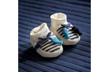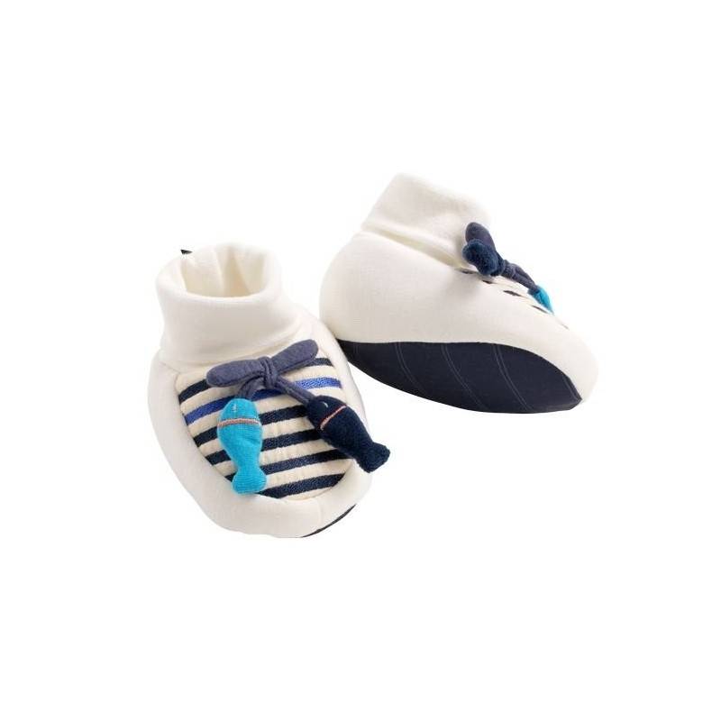 Bébé aura toujours les pieds au chaud et pourra s'amuser avec les petits poissons en quise de pampilles ! Les chaussons Baby Sailor s'associent parfaitement avec les pyjamas du même thème. Taille unique 0-6 mois.