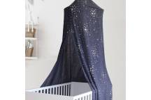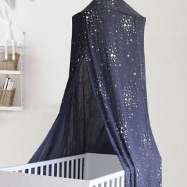 Ciel de lit bleu marine imprimé d'étoiles argentées.