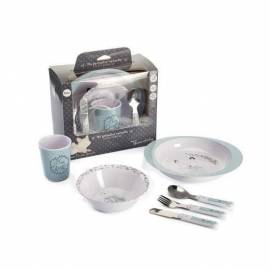 Le coffret contient : une assiette, un bol, un gobelet en mélamine ainsi que de 3 couverts (fourchette, couteau et cuillère) en acier inoxydable..