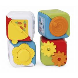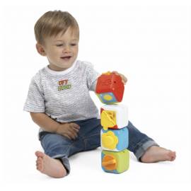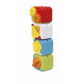 De 10 à 18 mois : L’enfant commence à empiler les cubes de façon aléatoire et découvre les activités sensorielles sur chaque cube (effets sonores, engrenages, fenêtres tournantes, etc.).