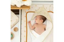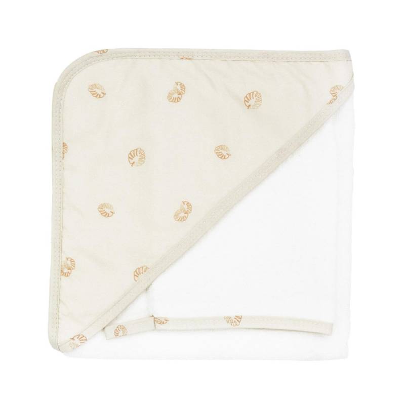 La capuche est conçue pour être placée sur la tête du bébé, lui procurant ainsi une source de chaleur supplémentaire et permettant de le sécher sereinement. De couleur écrue avec des motifs feuilles terracotta, cette sortie de bain est douce en tout point.