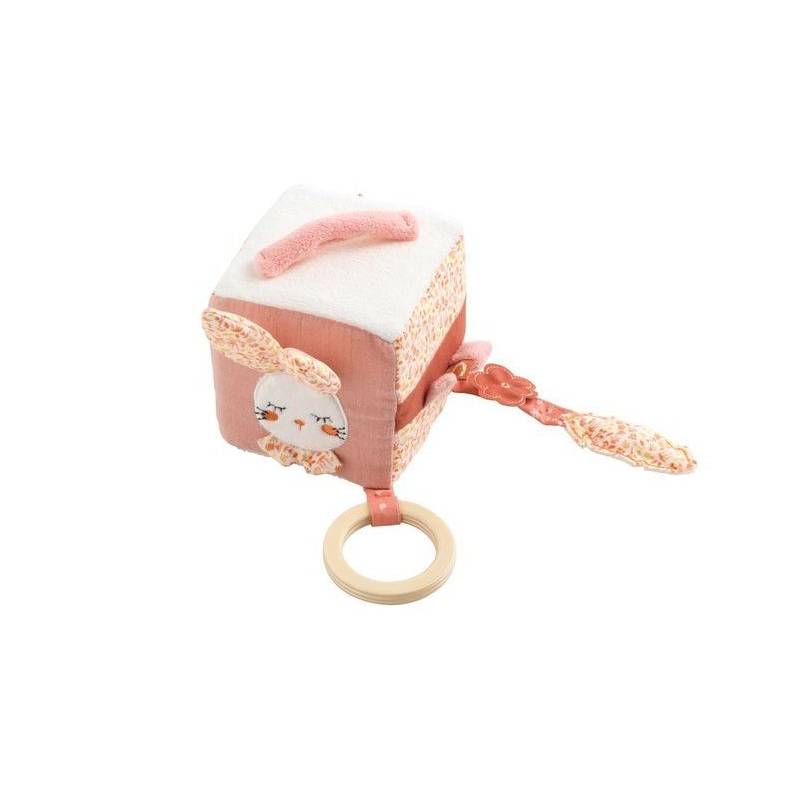 Cube d'activités utilisable dès la naissance. Idéal pour un cadeau de naissance, il éveillera bébé aux sons, aux couleurs et au toucher.