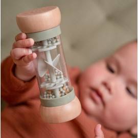 Le hochet de pluie est conçu pour les petites mains et est confortable à tenir. Le dessus et le dessous en bois sont décorés d'un dessin d'un mouton et d'un poulet de la collection Little Farm.