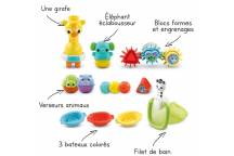 Avec son Maxi-coffret de bain multi-activité, Bébé développe sa motricité fine grâce à 15 jouets amusants. Les découvertes sont multiples et les jouets s'adaptent au développement des tout-petits.