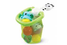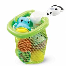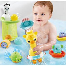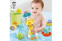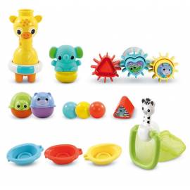 Ce super coffret est composé de 15 accessoires pour s'amuser dans le bain : 3 animaux verseurs, 1 girafe qui projette de l'eau, 3 bateaux, 3 formes, 3 engrenages, 3 balles et 1 panier pour les balles.