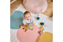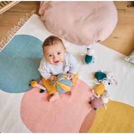 Pour stimuler la vue de bébé, les imprimés contrastés de cette balle en tissu ont été pensés pour s'adapter à la perception des contrastes de l'enfant.