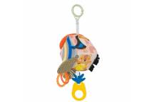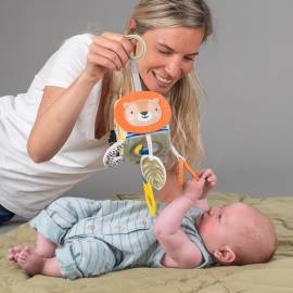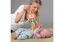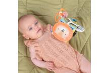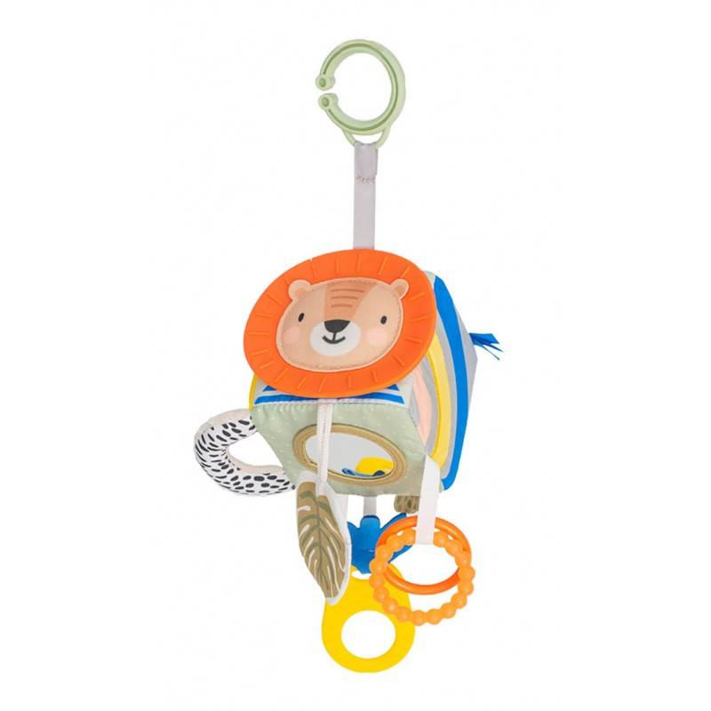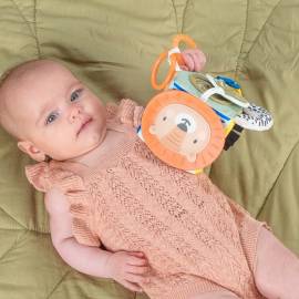 Un cube avec de nombreuses activités: feuilles bruissantes, miroir, crinière du lion à mordiller, tissu à attraper, anneau de dentition, anneaux en plastique et textures variées