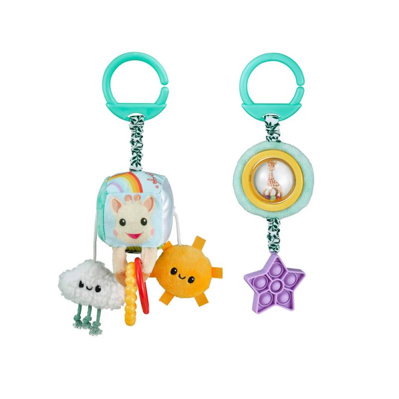Ce lot de 2 jouets à suspendre Sophie la Girafe accompagne bébé dans ses découvertes, à la maison comme en déplacement. Faciles à accrocher, ils se fixent sur une poussette, un cosy ou un parc pour divertir bébé partout.