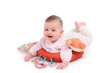 Le coussin intègre cinq éléments pensés pour éveiller la curiosité de bébé :