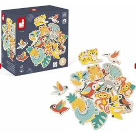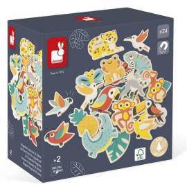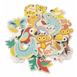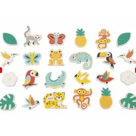 Ce set de 24 magnets en bois comprend une gamme colorée d’animaux fascinants : perroquets, crocodiles, jaguars, caméléons, lémuriens, singes, et bien plus encore.
