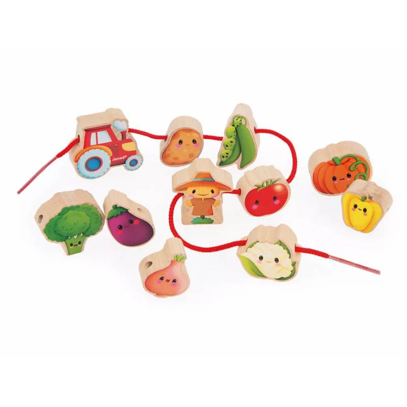Ce jouet d’éveil se compose de 11 pièces en bois (9 légumes, 1 tracteur et 1 épouvantail) et de 2 cordons. On retrouve des embouts rigides à l’extrémité de chaque cordon pour faciliter le passage des perles, idéal pour les petites mains potelées !