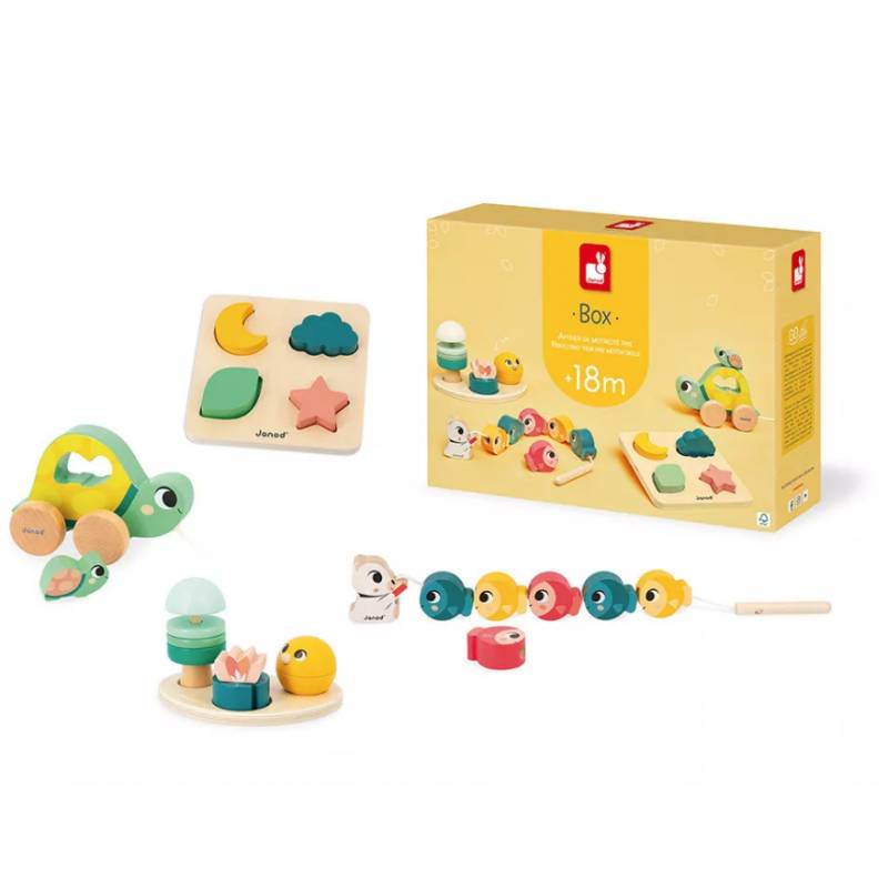 Conçue spécialement pour affiner la motricité fine, cette box bébé contient 4 jouets d’éveil amusants.