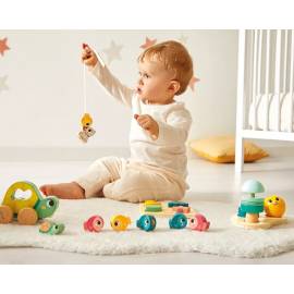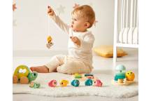 D’abord, une tortue à promener en bois accompagnée de son bébé : la figurine de la petite tortue est amovible, ce qui permet de promener maman tortue de 2 manières différentes (en tirant la ficelle, ou en la tenant par la carapace). Voilà un jouet à promener idéal pour encourager votre tout-petit à se déplacer !