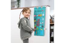 Ce panneau calendrier en tissu brodé, est spécialement conçu pour être accroché au mur avec sa baguette en bois. Les étiquettes amovibles en scratch sont faciles à manipuler pour les petites mains.
