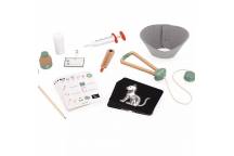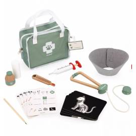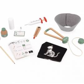 16 accessoires, dont 4 en bois : 1 badge de professionnel, 4 cartes "ordonnances" pour les prescriptions, 4 radios (chat, lapin, poisson et vue rapprochée d'un os), 1 crayon, 1 bandage, 1 collerette en feutrine, 1 stéthoscope, 1 seringue, 1 thermomètre et 1 pot de pommade