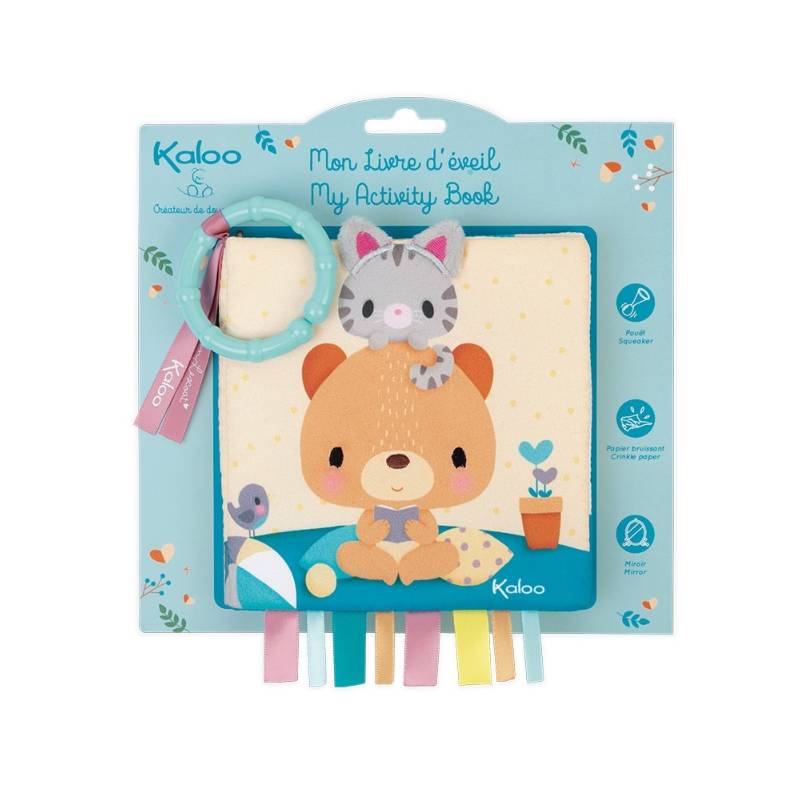 Il inclut plusieurs activités d'éveil : papier bruissant, pouêt, miroir, flaps et rubans à tripoter.