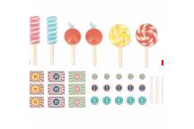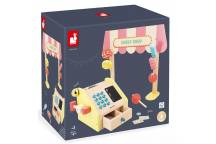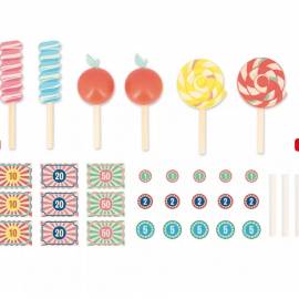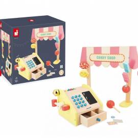 Accessoires variés : Les friandises en bois et les éléments de caisse permettent de recréer un véritable stand de confiseries.