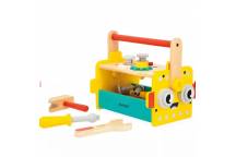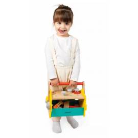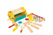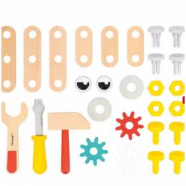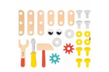 Conçu pour imiter les vrais outils de bricolage, ce jeu comprend tout le nécessaire pour les mini-bricoleurs : 3 outils (tournevis, clé, marteau), 13 pièces en bois (planches, engrenages), et 14 éléments de visserie (vis, clous).