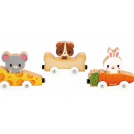 3 véhicules en bois (aubergine, maïs et fleurs des champs)