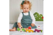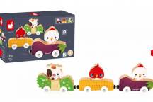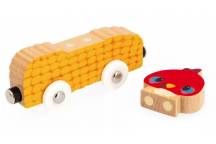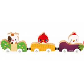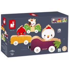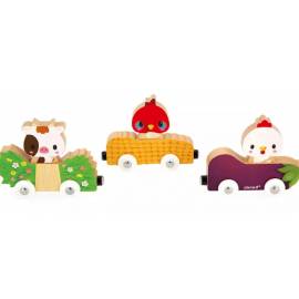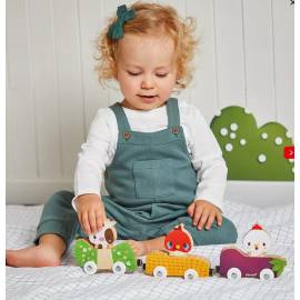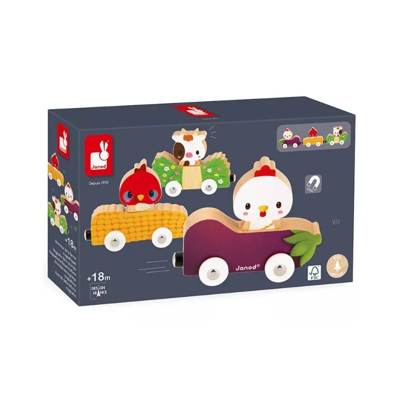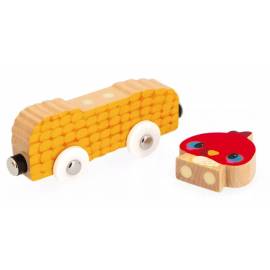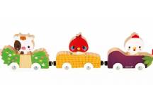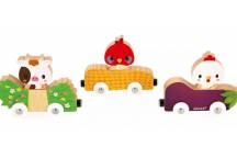 Ce jouet ludique et éducatif se compose de 3 adorables animaux de la ferme (poule, dindon et vache) et de leurs véhicules en bois magnétique aux formes amusantes (aubergine, maïs et fleurs des champs).