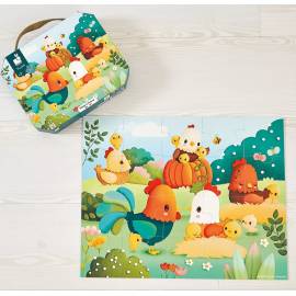 Les véritables stars de ce puzzle ? Les poules, bien sûr ! Avec le coq en vedette et les petits poussins espiègles, ce puzzle divertira bébé tout en l'aidant à découvrir le nom et les actions des animaux de la ferme.