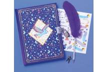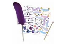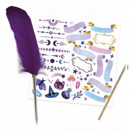 Le carnet est accompagné d'une planche de décalcomanies pour personnaliser chaque page et d'un stylo plume en forme de véritable plume, à encre violette, qui ajoute une touche de magie à l'écriture.
