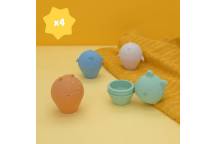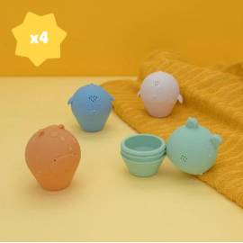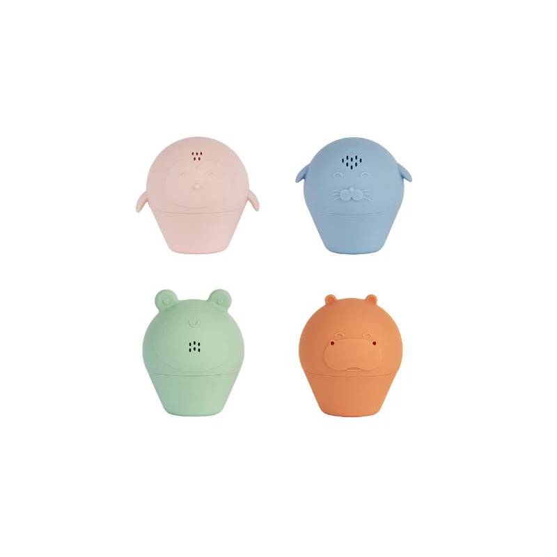 Ce lot de 4 petits animaux colorés (grenouille, hippopotame, pingouin et otarie) est conçu pour amuser tout en stimulant les sens et la motricité de bébé.