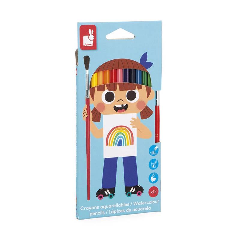 Ce kit de 12 crayons de couleur aquarellables est conçu pour les enfants à partir de 3 ans. Grâce à leur mine tendre et résistante, ils permettent un coloriage lumineux, qui peut ensuite se transformer en aquarelle avec le pinceau inclus. Une belle façon de combiner dessin et peinture dans une même création !