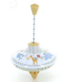 Faites tourner l’imagination de votre enfant avec cette toupie en métal illustrée sur le thème de la fête foraine.
