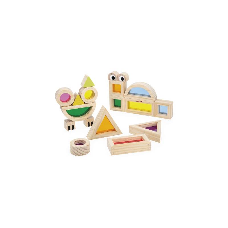 Les petits apprennent à reconnaître les couleurs en observant le monde à travers les blocs transparents, puis s’exercent à empiler et équilibrer les pièces comme de véritables petits architectes.
