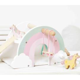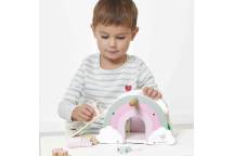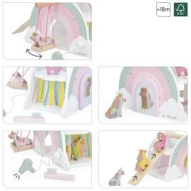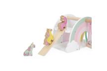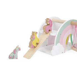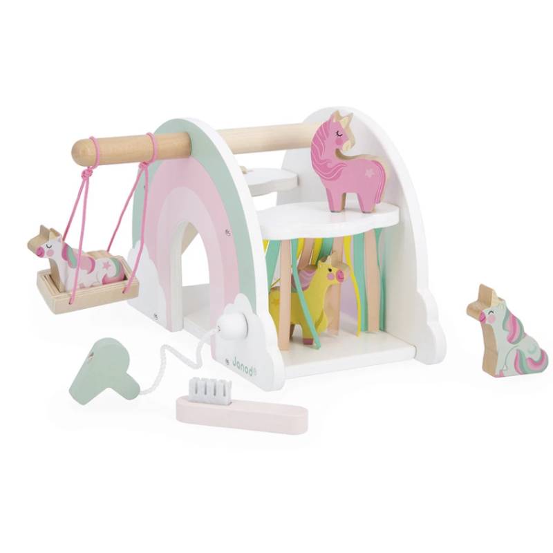 En forme d’arc-en-ciel, cette maisonnette colorée est livrée avec 4 figurines licornes et 2 accessoires pour imaginer mille aventures magiques.