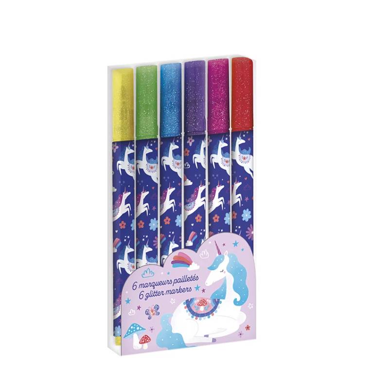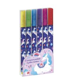 Donne de la couleur et de l’éclat à tes dessins avec cette pochette de 6 marqueurs pailletés Licorne, idéale pour les enfants dès 6 ans.