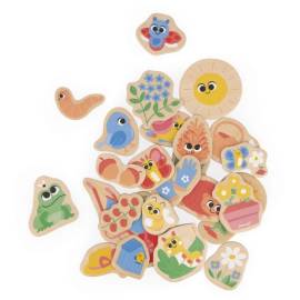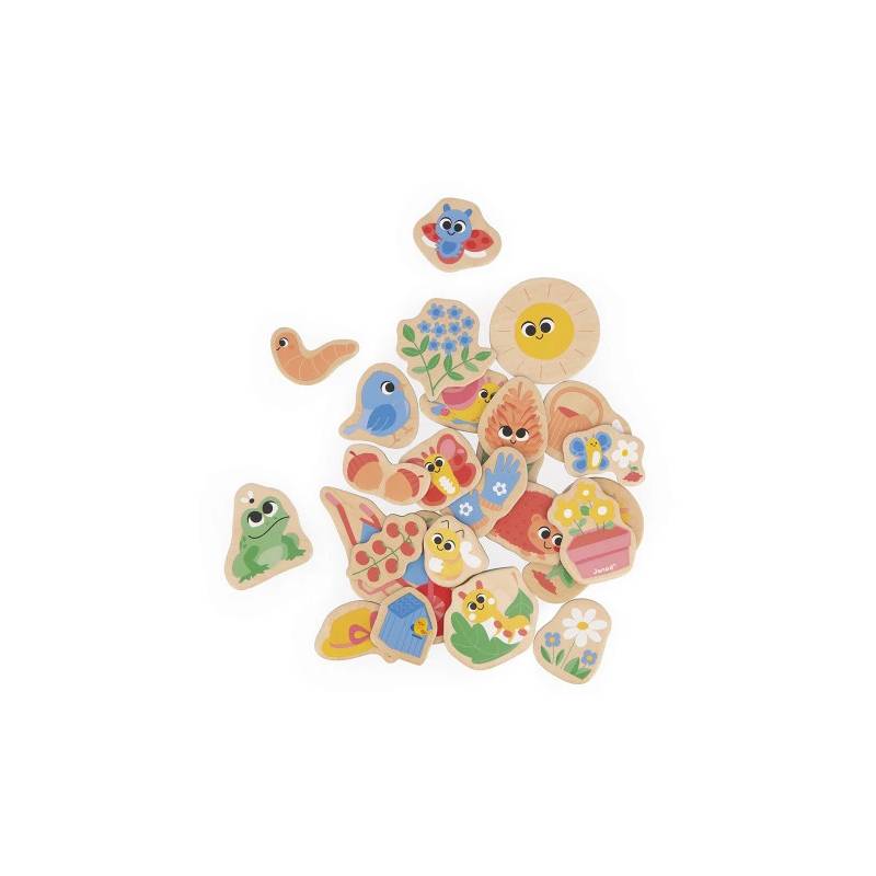 Dans mon jardin, il y a… plein de découvertes ! Ce set de 24 magnets en bois FSC™, conçu pour les enfants dès 2 ans, permet de recréer un univers bucolique sur le réfrigérateur ou le tableau magnétique.