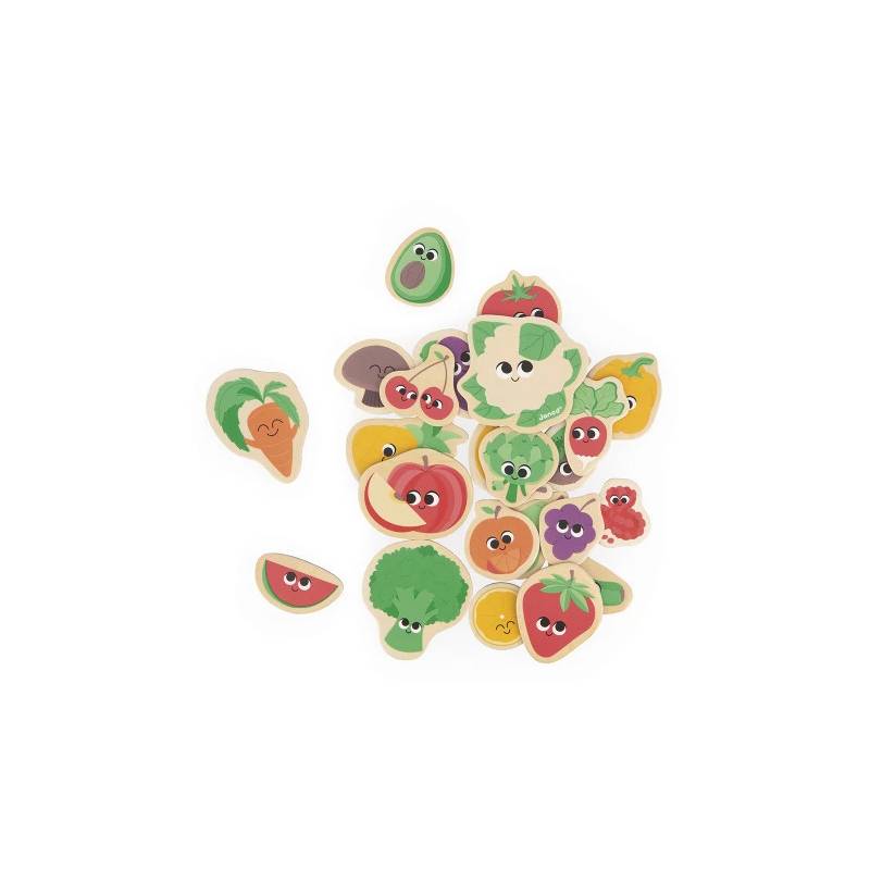 Les petits découvrent une variété de fruits et légumes expressifs, aux formes amusantes et pleines de caractère — dont une banane grincheuse qui fera sourire toute la famille. Ces aimants sont parfaits pour stimuler la motricité fine, la créativité et le vocabulaire des enfants, tout en les initiant à la saisonnalité des aliments.