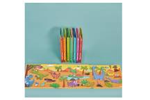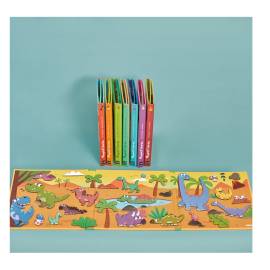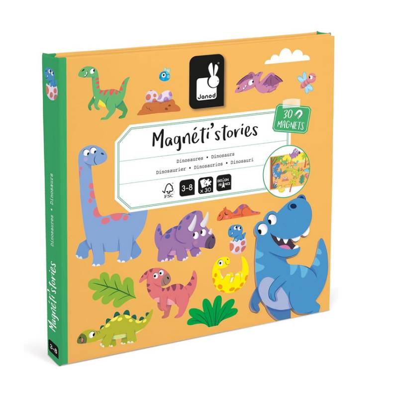 Le set comprend un décor illustré et 30 magnets représentant différents dinosaures, paysages et éléments naturels. L’enfant développe sa motricité fine en manipulant les pièces aimantées, tout en stimulant sa créativité à travers d’innombrables histoires qu’il imagine et met en scène.